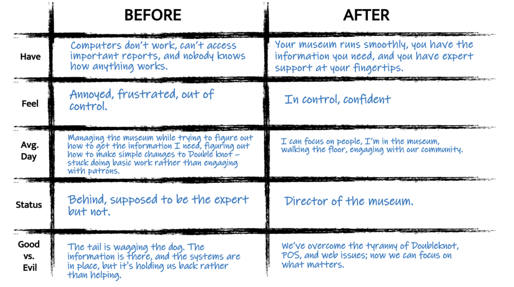 Transformation is how solving the problem impacts them. Ultimately, all anybody ever buys is transformation, so defining the transformation matters, but you may find this easier once you’ve completed the next module and defined the Job to Be Done.